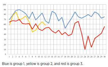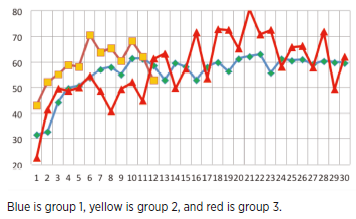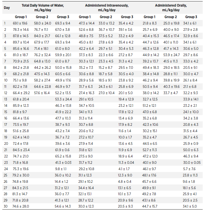 In group 2, rate of parenteral administration during the first 10 days of treatment ranged from 43% on day 1 to 70% on day 6. On day 1 of treatment, 32% of group 1 received intravenous injections, with an increase to the maximum value on day 10 of 60% (Figure 1). Injected volume slightly fluctuated throughout the observation period. In group 3, 23% received intravenous administration on day 1; in addition, group 3 showed a wave-like increase of intravenous administration, with a maximum of 80% receiving treatment on day 21, followed by a gradual decrease to 60%. This finding demonstrated the feasibility and effectiveness of parenteral infusion during a later course of treatment, which amounted to at least 60% of the total daily fluid load.