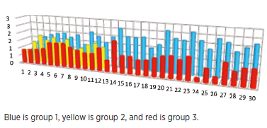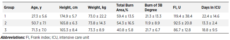 As shown in Table 1, group 1 had an average age of 27.3 ± 5.6 years, group 2 had an average age of 50.7 ± 7.1 years, and group 3 had an average age of 71.3 ± 7.0 years. Total burn area and area of deep burn damage to the skin were similar among the groups. The highest Frank index (FI; used to determine the severity of a burn injury) was identified in group 1. Group 1 also had the longest duration of intensive therapy in the intensive care unit and the most evident burns in terms of area and depth.