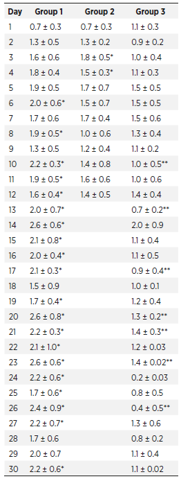 As shown in Table 3, the volume of diuresis in group 1 over the first 5 days was not different from physiological values. A moderate polyuria was observed in the following days, due to the need for detoxification therapy. An increase in hourly discharge was observed in group 2 on days 3 and 4. In group 3, hourly diuresis was within normal limits. However, group 1 showed great differences after 10 days of intensive therapy on days 10, 13, 17, and 26. This fact was associated with drug stimulation according to indications (Figure 2). During the period of toxemia, hourly renal excretory activity was most evident in group 1, which corresponded to a greater volume of water load and the severity of burn injury.