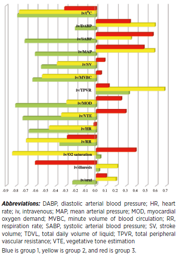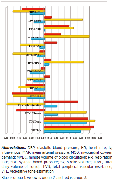 In group 1, which had an average volume of intravenous infusion of 76 ± 7 mL/kg/day, an inverse correlation was found between the volume of infusion therapy and changes in body temperature (-0.8) (Figure 5). In group 2, this inverse correlation was -0.8, reflecting the effectiveness of intravenous detoxification therapy. However, a further increase in water load resulted in negative correlation with systolic blood pressure (-0.7) and mean blood pressure (-0.6), as well as a negative correlation with minute volume of blood circulation (-0.6) and stroke volume (-0.5). In group 1, an inverse correlation was found between volume of infusion therapy and changes in body temperature (-0.8), which was also shown in group 2 (-0.8). These results reflect the effectiveness of intravenous detoxification therapy. However, a further increase in water load in group 1 resulted in a negative correlation with systolic blood pressure (-0.7), mean blood pressure (-0.6), minute volume of blood circulation (-0.6), and stroke volume (-0.5).