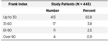 In patients who had general electrothermal trauma with skin lesions in the form of a “mark,” patients had thermal damage isolated to the fingers and hands. In the 119 patients with electric burns who required surgical treatment, 38 patients (31.1%) had isolated lesions of the head (n = 2), upper extremities (n = 33), and lower extremities (n = 2). In all other cases, multiple and/or widespread burns of 2 or more anatomic zones were diagnosed (Figure 1). Most patients had Frank index values up to 30 units (Table 2).