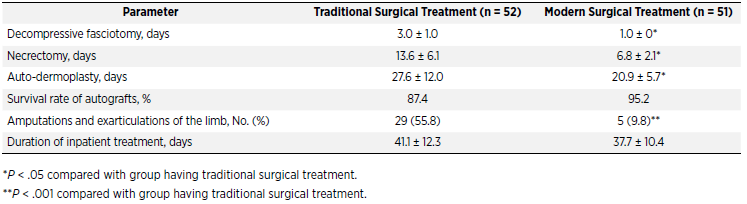 The modern tactic of early fasciotomy on the first day of injury and early necrectomy (by 6.8 ± 2.1 days after injury) contributed to a significant reduction in the frequency of crippling operations (amputation and exarticulation of limbs) from 55.8% to 9.8%, allowed auto-dermoplasty to be conducted 1 week earlier (compared with traditional tactics), improved engrafting ability of autografts from 87.4% to 95.2%, and reduced the duration of inpatient treatment from 41.1 ± 12.3 to 37.7± 10.4 days.