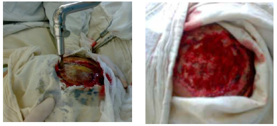 The desire to comply with the principle of early simultaneous radical osteo-necrectomy prompted us to improve osteonecrosis surgery of the bones of the cranial vault. With lesions of up to one-third of the area of the cranial vault, the entire wound surface was treated at once, applying the milling holes more closely (0.5 cm) to each other (Figure 2).