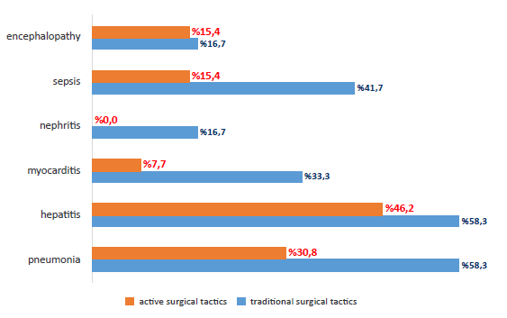 In general, with the use of modern surgical tactics, complications were notably decreased; in particular, septic complications decreased by 2.7 times (Figure 3).