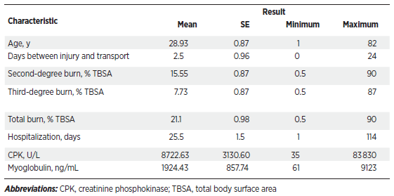 The average transport time from the occurrence of the accident to our centers was 2.5 days. Mean total body surface area percentage was 21.1%. The average length of hospital stay for the patients was 25.5 days. At the time of patient admission, average serum CPK level was 8722.63 U/L and mean blood myoglobin level was 1924.43 ng/mL Table 1.