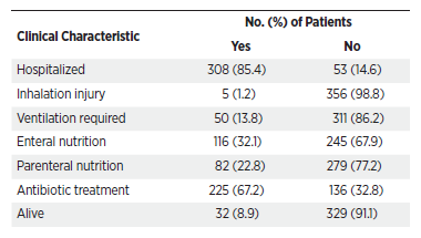 For infection control, patients received wound debridement as soon as they were stable. Patients received tetanus prophylaxis, topical antibiotics to burned regions, and systemic antibiotics according to tissue cultures.