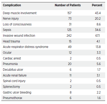 The most common complication observed in our patients was invasive wound infection (67.1%). This complication was followed by deep muscle involvement (43.4%), sepsis (34.6%), peripheral nerve damage (20.2%), and acute respiratory distress syndrome (13.8%). In addition to these frequently encountered complications, other complications included altered consciousness, pneumonia, head trauma, acute kidney failure, eye complications, gastric ulcer bleeding, decubitus ulcers, pneumothorax, cardiac arrest, spinal cord injury, and splenic injury Table 4.