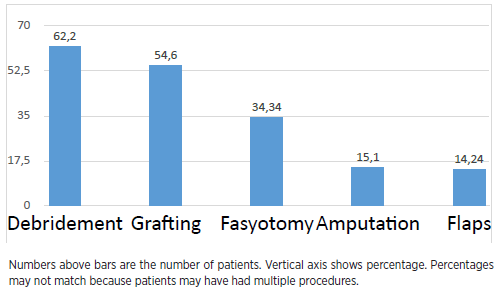 When we examined the surgical procedures performed on our patients, debridement was applied to 62.2%, grafting to 54.6%, fasciotomy to 33.7%, amputation to 15.1%, and flaps to 14.24% of patients Figure 8. Anatomical regions of the amputations are shown in Table 5 and Figure 9; amputation occurred in a total of 55 anatomical regions.