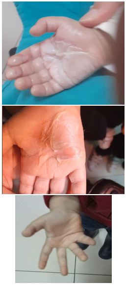 For small- to medium-sized burns, practitioners in our clinic avoid laying the children on a bed. Instead, after a sterile cover is placed on the lap of their parent, the child is placed on the parent’s lap. The agent polyhexamethylene biguanide (PHMB) is applied, sprayed from a distance of 15 cm without touching the wound and without wiping it off, taking care not to burst any blisters. A wireless electrical stimulation is then applied for 10 minutes, and dressing with is completed with gauze pads soaked in PHMB gel, ensuring the process is pain free. Any necrotic tissue left from blisters is removed after epithelialization is complete.