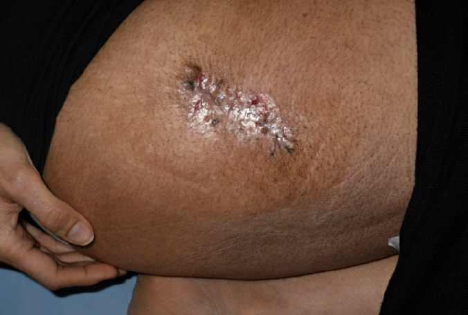 The patient underwent debridement under general anesthesia before primary closure of her wound with 20 PDS, 30 Monocryl, and 30 Prolene sutures. After the procedure, the patient required weekly dressing changes for 4 weeks. Sutures were removed at 2 weeks. The patient achieved complete wound healing after 5 weeks but was left with a permanent scar and contour irregularity (Figure 3). She was discharged from acute care with scar management guidance.