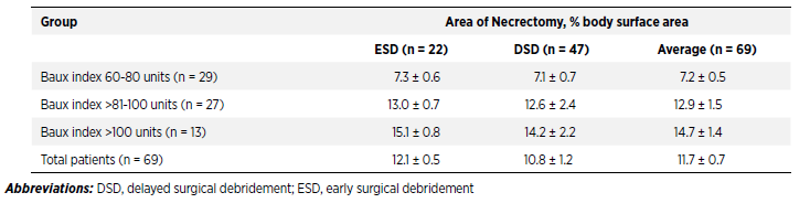 Table 1.Average Area of Necrectomy During Early and Delayed Surgical Debridement in Older Burn Patients (Aged >60 Years) With Different Severity of Thermal Injury