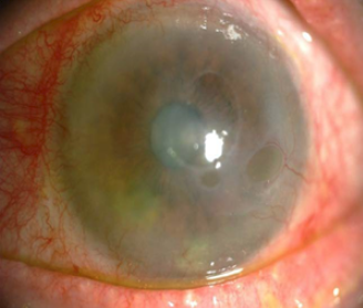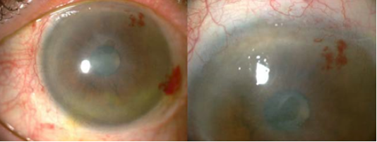 When corneal epithelial stem cells become dysfunctional or deficient, limbal stem cell deficiency (LSCD) develops.1 Limbal stem cell deficiency leads to neovascularization of the corneal surface, persistent epithelial defects, scarring, and decreased vision. Simple limbal epithelial transplant (SLET) is a relatively new technique for addressing LSCD.2 Limbal tissue from a patient’s healthy eye is transplanted onto an amniotic membrane attached to the surface of the diseased eye, where the tissue can expand in vivo.3 Here, we describe a patient with unilateral limbal stem cell deficiency who was treated with SLET.