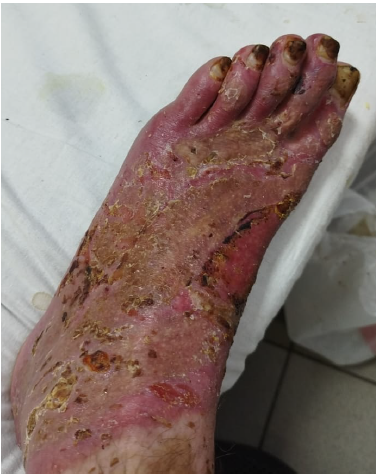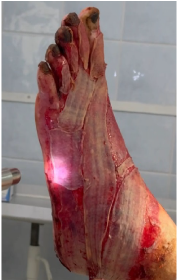 As a clinical example, a 34-year-old patient (patient M) was treated in the thermal injury department with the diagnosis of 18% (6%) second to third degree burns of the lower extremities. On day 18, the patient received skin graft transplant of nonperforated grafts on granulating wounds on the dorsal surface of the feet and the ankle joint area, followed by treatment of the grafts with LTAP (Figure 1). The result of the operation (10 points after 7 days) is shown in (Figure 2).